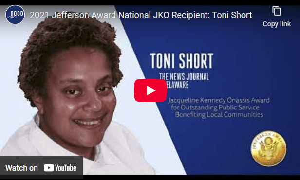Not long after sustaining a neck injury as a registered nurse, Toni Short became homeless. She pulled into the Rehoboth Walmart parking lot where she lived for two years. But once she realized she was not the only homeless person there, she set out to help them all: motel rooms, meals, clothes, and money for people without homes. In 2015, she started the nonprofit Lighthouse for Broken Wings to provide permanent supportive housing for people experiencing homelessness. The first transitional house opened in 2016 and welcomed the people who had been living in their cars in the Walmart parking lot with her. She has worked without pay for her foundation and used her own money from outside jobs to pay for those who cannot pay to live in her houses, impacting the lives of over 500 people and raising $30,000.